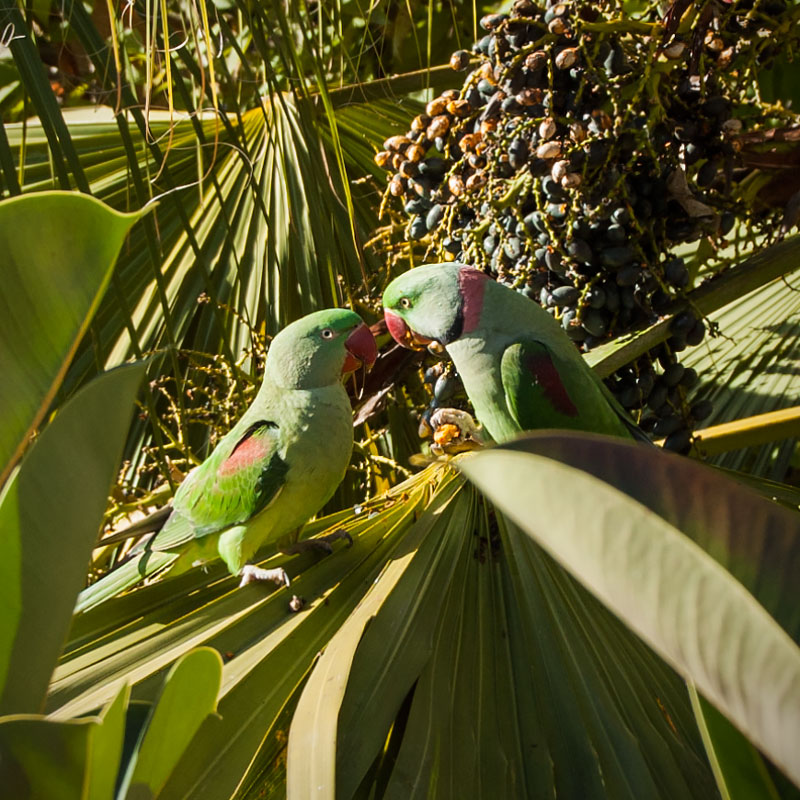 Birds love the lush Norbulingka gardens and both species can be spotted most of the year, in summer blending with the foliage and feeding on wild figs and crab apples, and in winter, on the sour cherries that follow the November blooms of the wild cherry trees. Parrots find readymade nests in the cavities of trees, where they leave tell-tale signs of their presence with tiny green feathers caught up in the tree bark. Paradise fly catchers build neat little nests in the high branches of trees, some in such number that they were nicknamed bird condominiums.