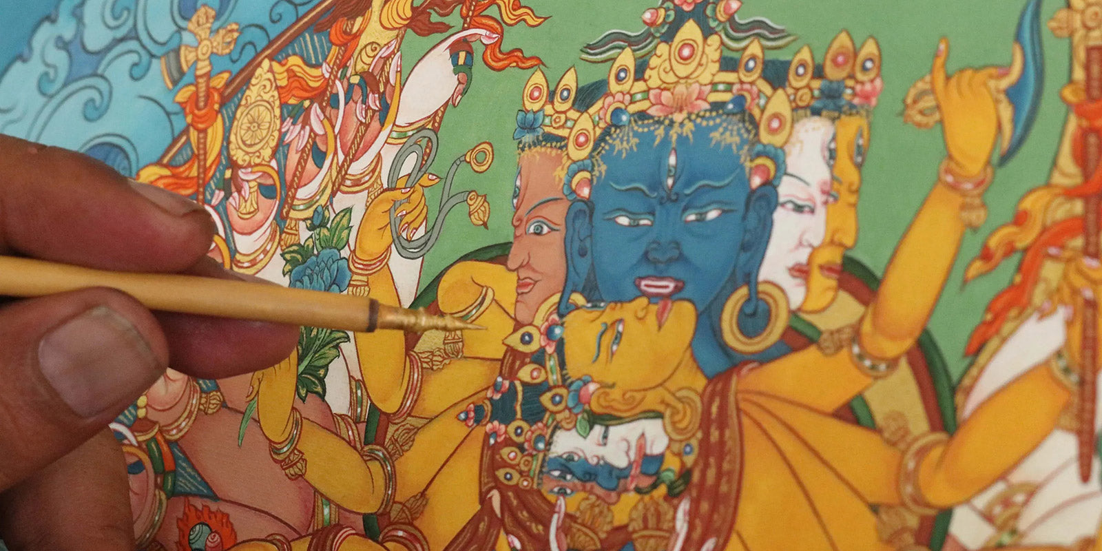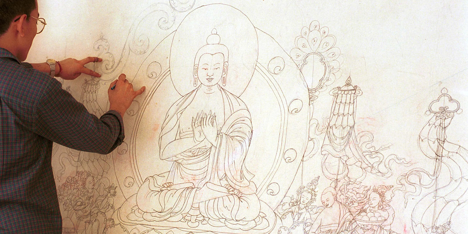 Aspiring thangka artists begin by studying the iconographic grids and proportions of different deities and then master mixing and applying mineral pigments. Norbulingka offers a three-year thangka training program. Upon completion, a student can join the workshop and apprentice for three years, assisting the masters or painting their own simple pieces, depending on their ability.