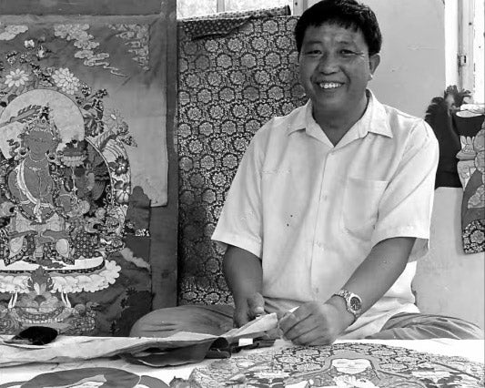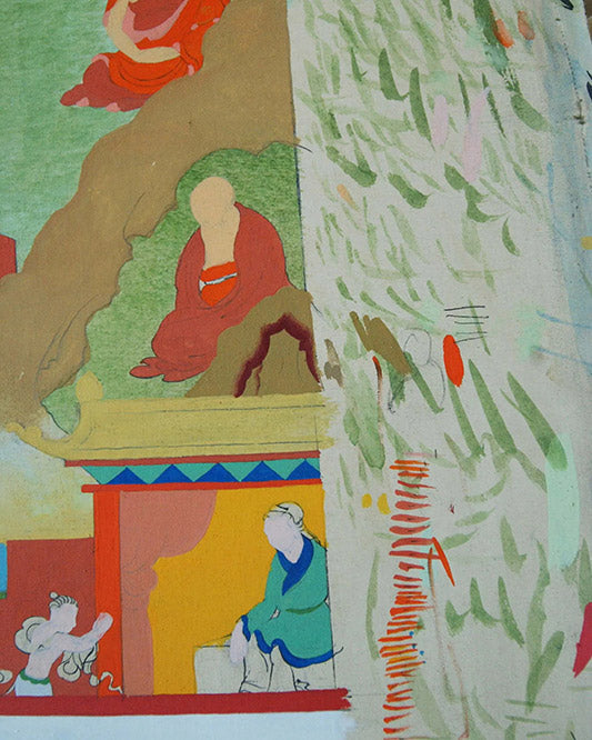 The first step in the making of a thangka is stitching canvas onto a wooden frame and preparing the surface with a mixture of chalk, gesso, and base pigment, which is rubbed in until the texture of the cloth is no longer apparent. The outline of the deity is then sketched in pencil using the iconographic grid pertaining to the deity being depicted, then outlined in black ink. Powders of crushed mineral and vegetable pigments are mixed with water and adhesive to create paint. Landscape elements are blocked in and shading is applied using both wet and dry brush techniques. Finally, 24 kt gold paint is added in certain areas for highlights, and the piece is framed in a precious brocade border. A standard thangka in our collection, which is about 18 x 12 in., takes an artist about six weeks to complete.