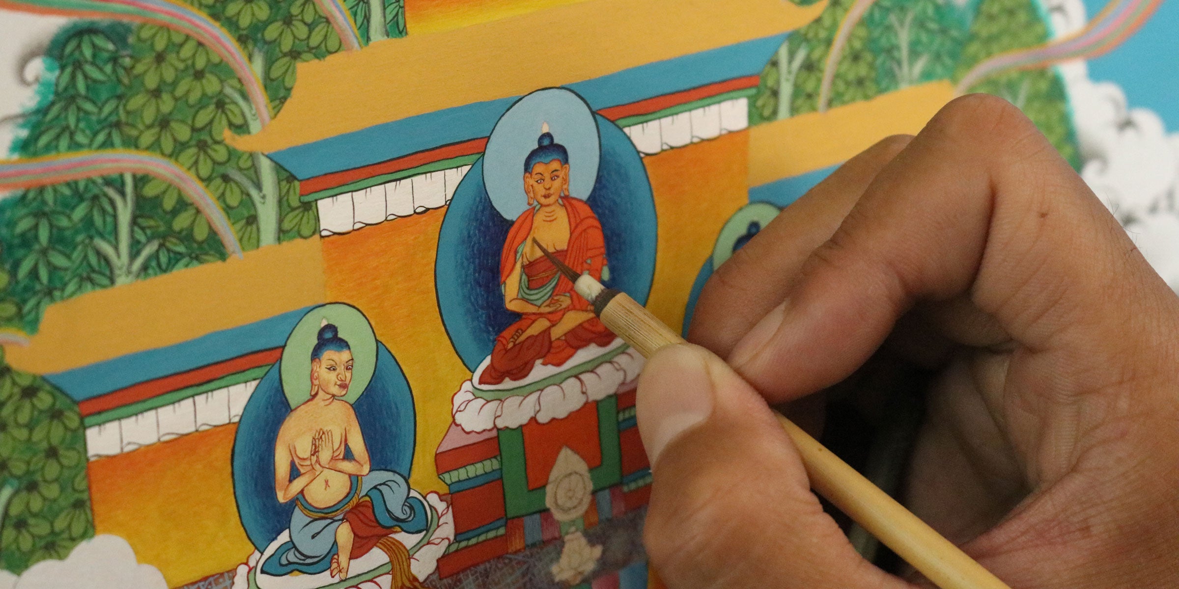 Aspiring thangka artists begin by studying the iconographic grids and proportions of different deities and then master mixing and applying mineral pigments. Norbulingka offers a three-year thangka training program. Upon completion, a student can join the workshop and apprentice for three years, assisting the masters or painting their own simple pieces, depending on their ability.